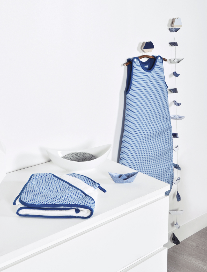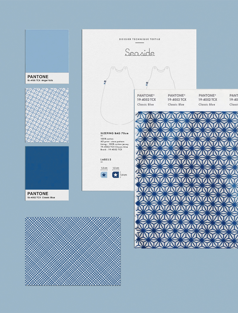Au cours de mes 10 ans au sein de la société Lilipinso, j’ai largement exploré l’univers du textile que ce soit au travers de ses spécificités comme de ses contraintes. En collaboration avec la marque de puériculture Natalys, nous avons réalisé une collection complète, nommée Seaside, évoquant le thème de la mer. Au travers de motifs géométriques évoquant le bleu des océans et l’univers marin, j’ai travaillé trois « all over », déclinés ensuite sous différentes formes. Le linge de lit Seaside s’exprime au travers de gigoteuses, tour de lit, coffret debain ou encore coussins décoratifs. Le tout vient s’associer à une collection d’objet de décoration coordonnée (guirlande, patère, papier peint, stickers…), l’essence même de Lilipinso.
