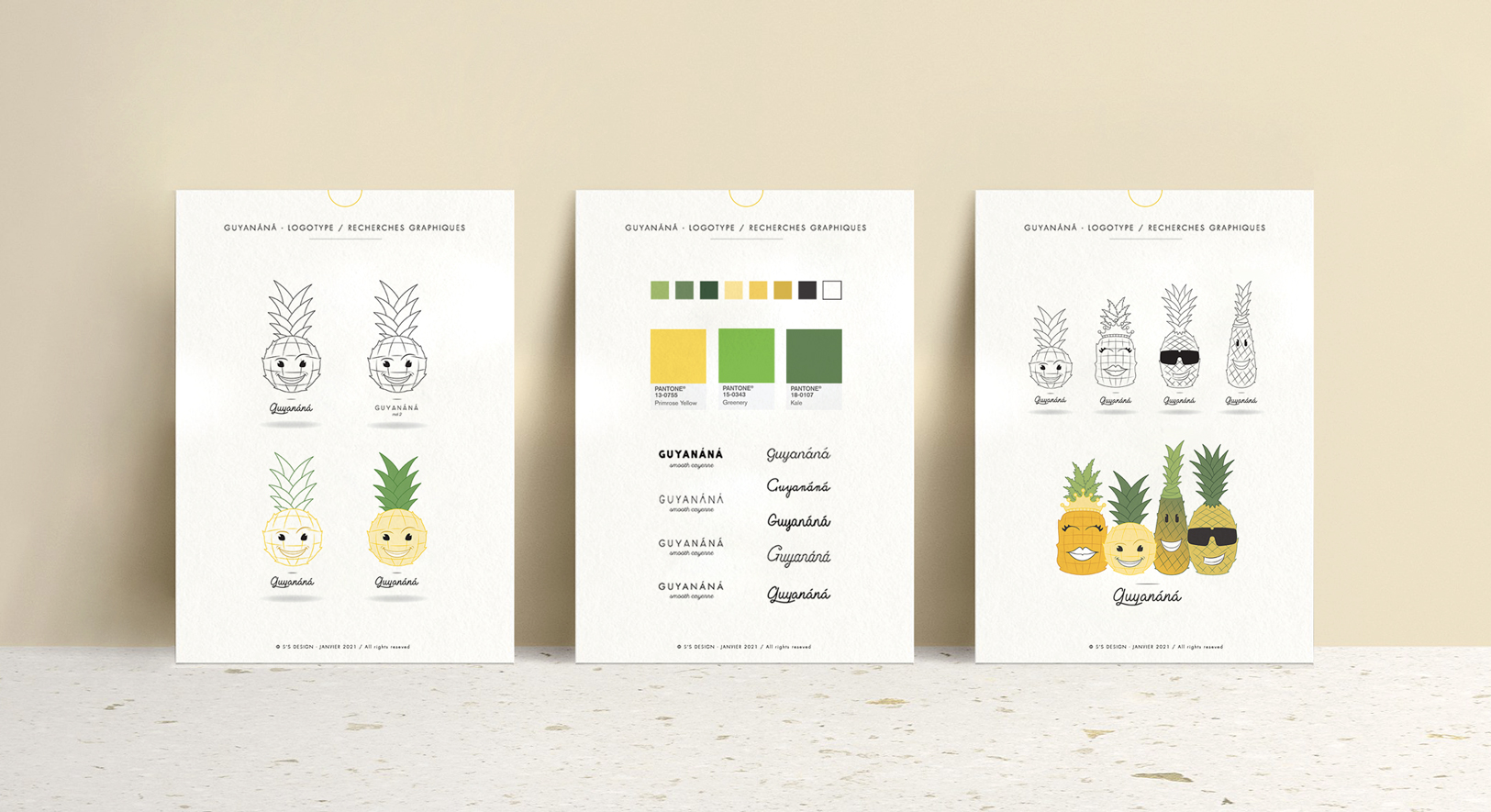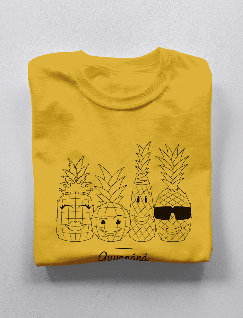 Étape 1, créer le branding de la marque au travers d’une nouvelle identité visuelle représentant les 4 différentes variétés d’ananas. Ces représentations volontairement humanisées selon le souhait de Guillaume, permettent à la marque de se rapprocher de ses clients. Étape 2, combiner les 4 versions pour n’en créer qu’une seule et trouver l’unité de la marque. Enfin, la dernière étape, le passage en couleurs et la déclinaison de sérigraphies textile, afin de mettre en place une gamme commercialisée de tee-shirts, femme, hommes et enfants. La prochaine étape… étendre la gamme avec de nouveaux visuels… Créativité en cours !